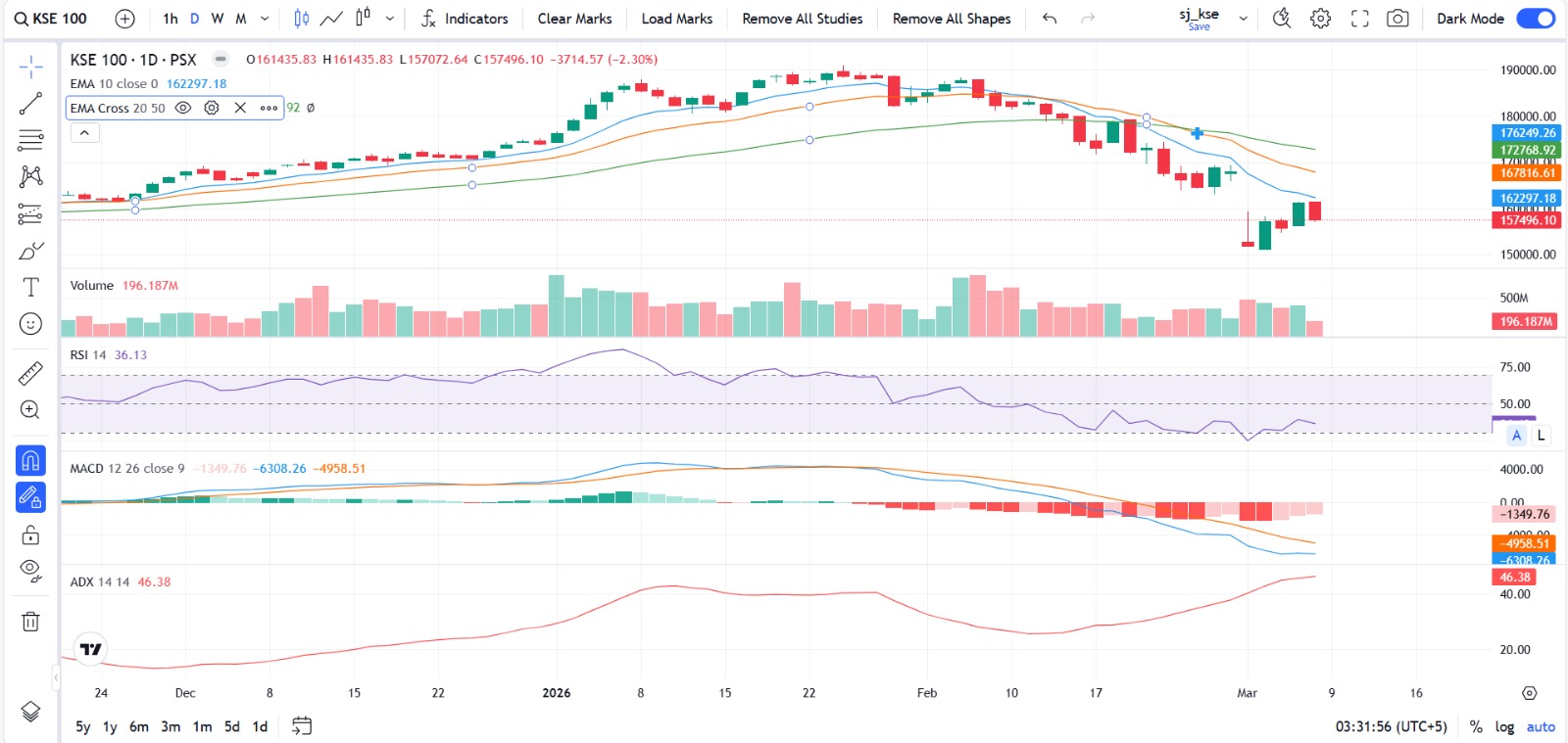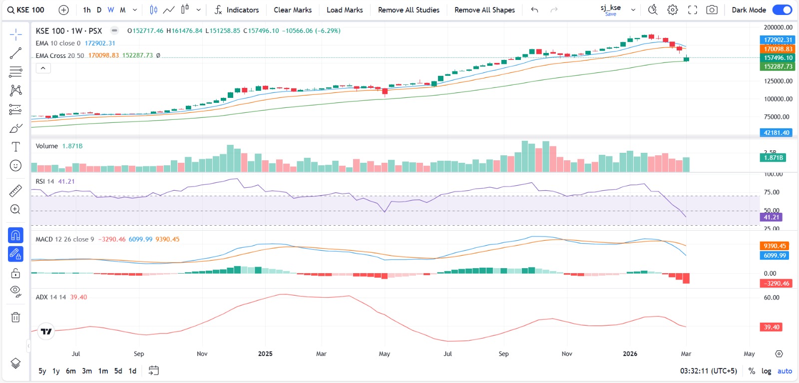 Monday could prove decisive for the KSE-100. The index has already lost its short- and medium-term trend structure on the daily chart and now sits just above the 50-week exponential moving average (152,287.73), the final technical support on the weekly timeframe. With geopolitical tensions driving oil prices higher and the State Bank of Pakistan (SBP) due to announce its policy decision the same day, the market enters the new week facing a convergence of technical and macro risks.